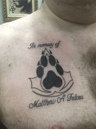 My third; an newest tattoo is a memorial to a roommate who passed away and is located on my upper right chest! Got it April 2019 at Self Inflicted Studios[Saint Peters, MO Location!]. Size is about 6"x 6"