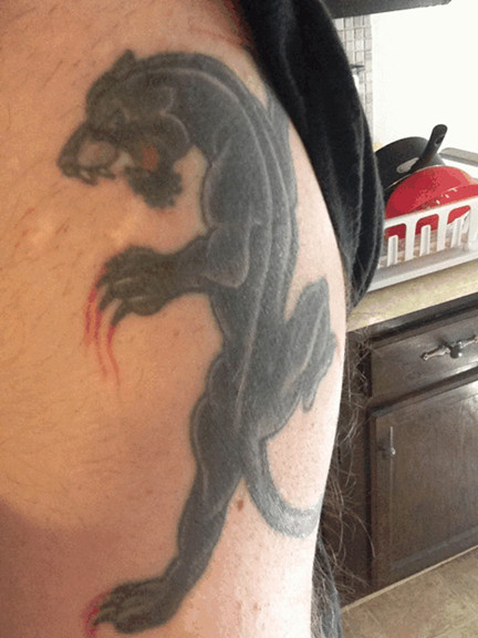 My second; tattoo is of a Crawling Panther and is located on my left, upper arm! Got it november '07 at Psycho Tattoo(now known as SinkorSwimStudios)[Marietta, GA Location]! Size is about 6"x 4"